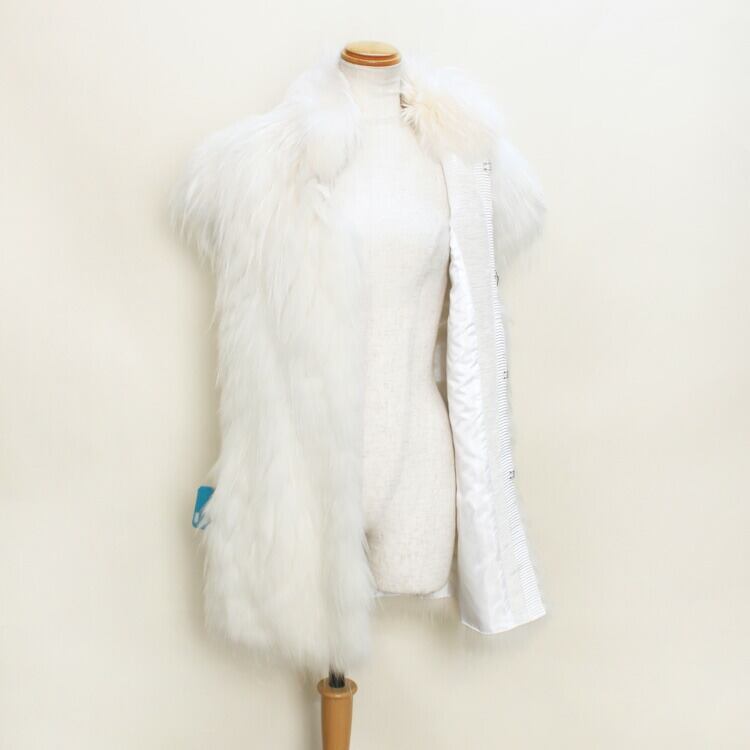 【サイズ(最大部を計測)】Mサイズ相当:着丈約75cm 身幅約88cm 肩幅約38cm アームホール約50cm 【重さ】約350g 【留め具】ホック×4 【素材】ラクーン(タヌキ) 【内側ポケット】無し 【外側ポケット】2つ 【裏地】有り