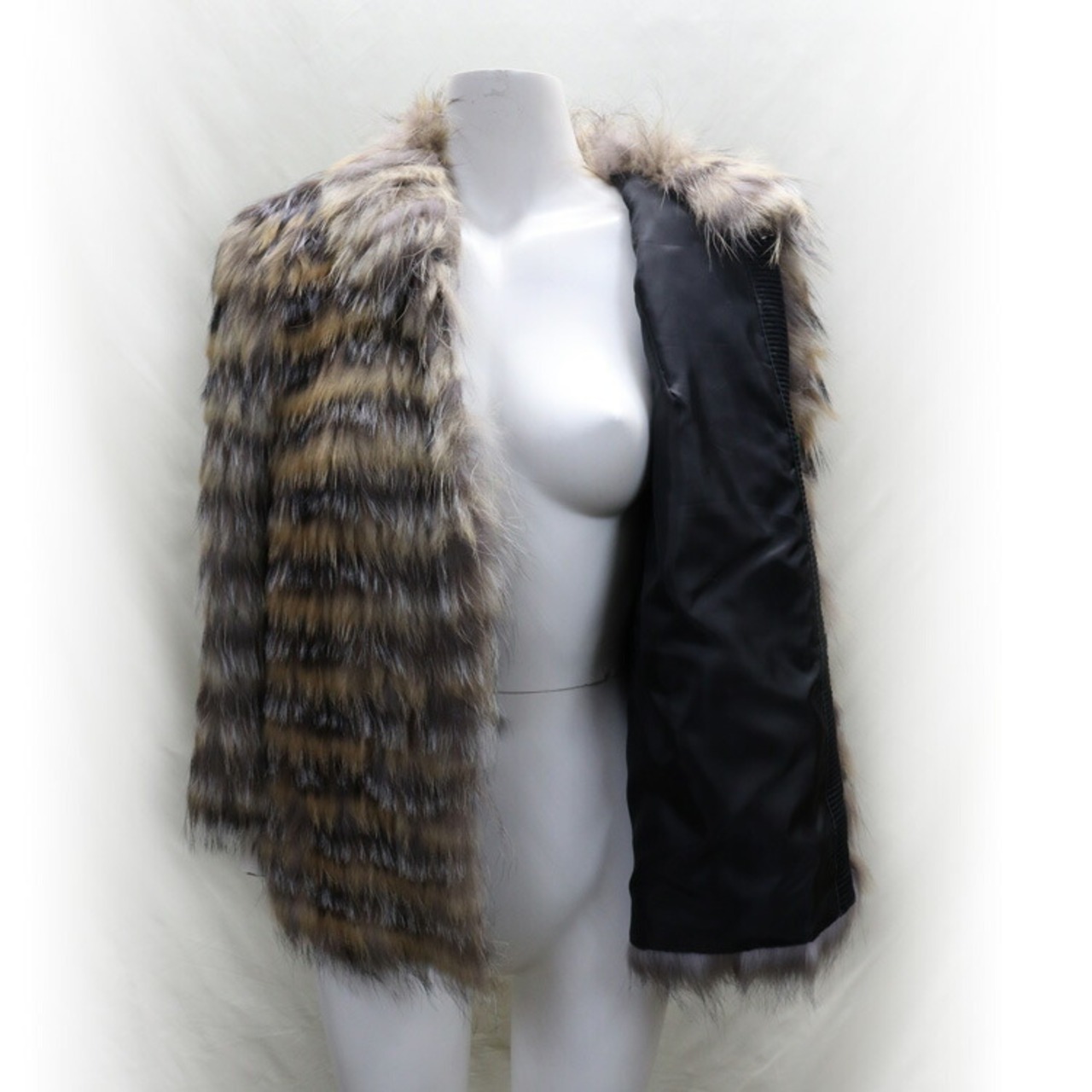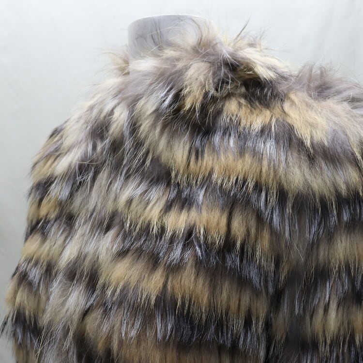【サイズ(最大部を計測)】着丈約61cm 身幅約94cm 裄丈約58cm 【重さ】約380g 【外側ポケット】2つ 【内側ポケット】無し 【留め具】ホック×3 【裏地】有り 【素材】ラクーン(タヌキ)、シルバーフォックス