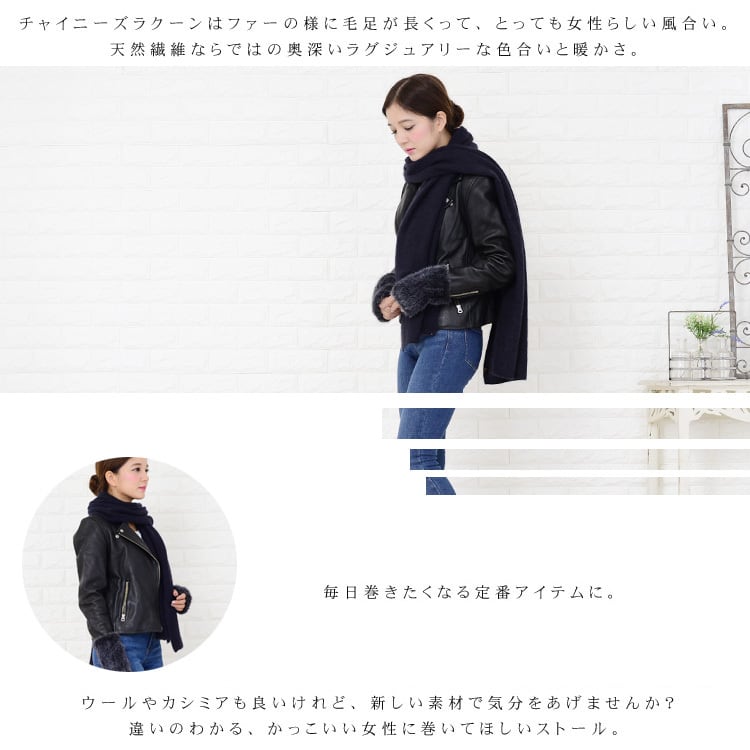 チャイニーズラクーン ファー 100% ニット ストール マフラー 毛100% 天竺編み レディース メンズ ギフト プレゼント ネイビー キャメル ふわふわ 無地 シンプル RCCS51