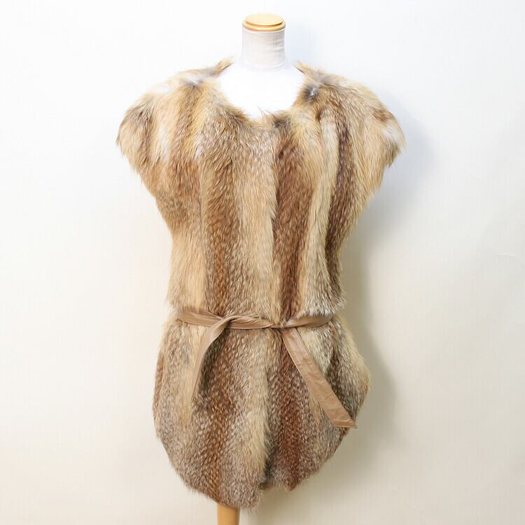グレーから黄金色に輝くグラデーションが美しい、レッドフォックスのファーアウターです。ボタンを留めてジャケットなどトップスに。ウエストで縛って、ジレやベストのようにも着こなせます。