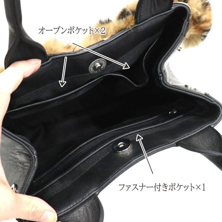 【サイズ(最大部を計測)】縦幅約16cm 横幅約25cm マチ幅約10cm ハンドル持ち上がり約15cm 【重さ】約400g 【内側収納】オープンポケット×2、ファスナー付きポケット×1 【外側収納】オープンポケット×1 【留め具】マグネットボタン 【裏地】有り 【素材】レッキスラビット