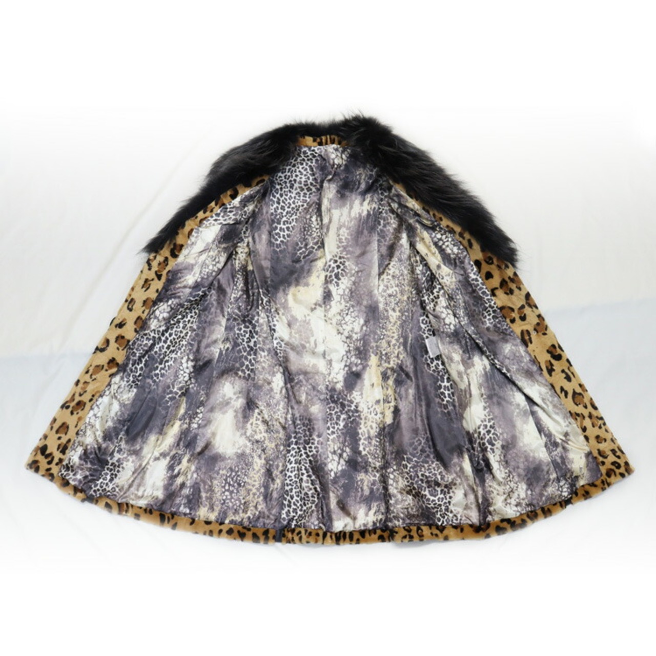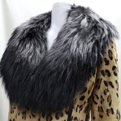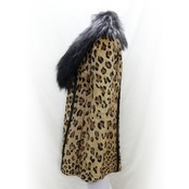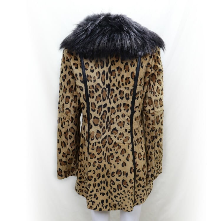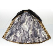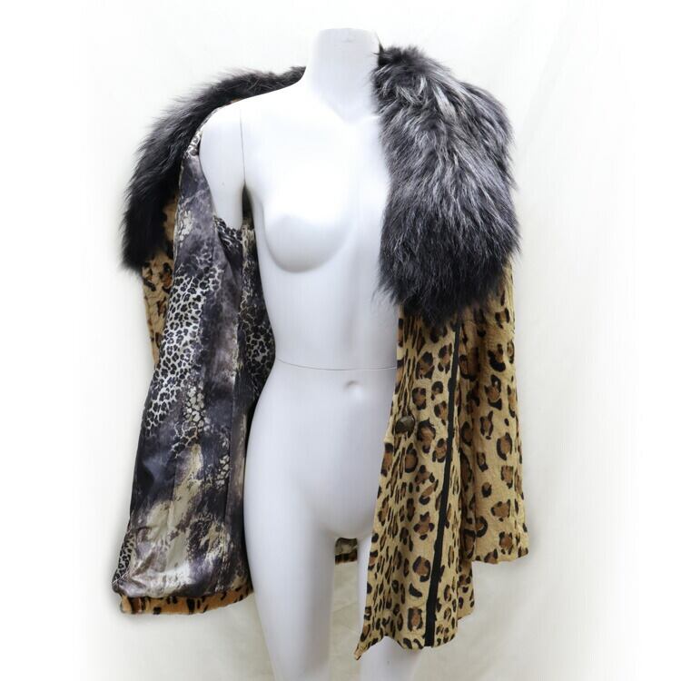 ボリューミィなラクーン襟にアニマル柄のレッキスラビットがインパクトのあるファージャケット。裏地もアニマル柄でよりワイルドに。