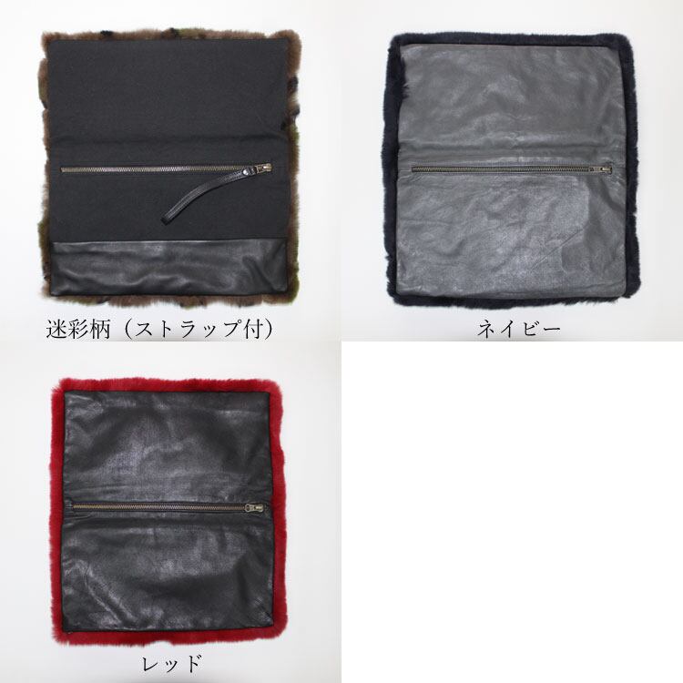 【サイズ(最大部を計測)】縦幅約36cm 横幅約35cm マチ幅約1cm 【重さ】約280g 【内側収納】無し 【外側収納】無し 【留め具】ファスナー 【素材】レッキスラビット、内側:ラムレザー(迷彩柄のみ生地・一部ラムレザー)