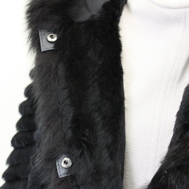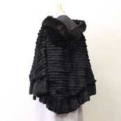 ふわふわのレッキスラビットをボーダー状に仕上げたファーケープです。ボリューミーなフォックスをトリミング、シックなブラックカラーながら個性的なシルエット。