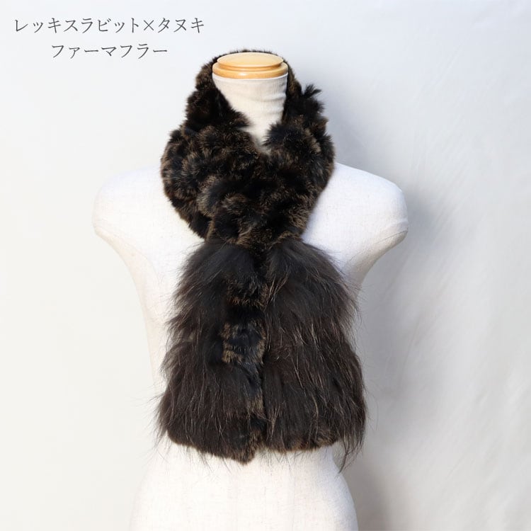 ふわふわのレッキスラビットとラクーンのファーをニット生地に編み込んだマフラーです。リバーシブル仕様、マフラーの片側を通せるスリット付きで、どなたでもオシャレに着用できます。