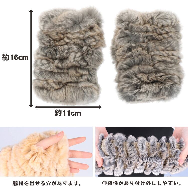 【サイズ(平置き時・最大部を計測)】毛を含む:長さ約16から17cm、甲幅約11.5cm(+約4cm程伸縮します) 【重さ】約50g(約25g×2) 【裏地】無し 【仕様】親指用通し穴有り 【素材】レッキスラビット、アクリルニット 【生産国】中国