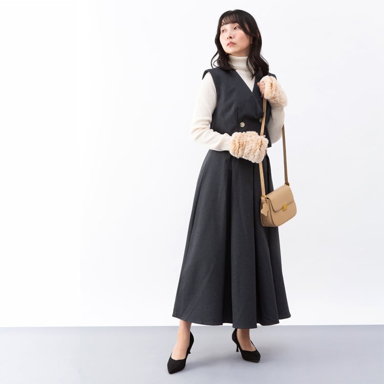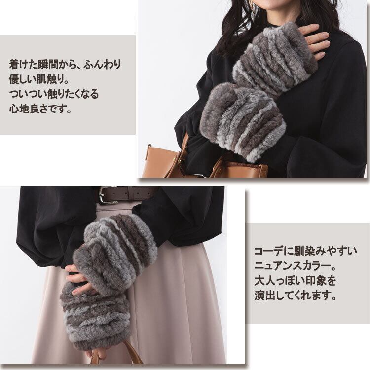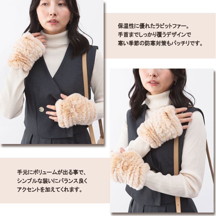 その為、手触りがとてもなめらかで、毛が抜けにくいのも魅力です。親指を出す通し穴付き。ストレッチ性のあるニット生地はフィットして手に馴染みます。ファーの間からニット生地が見えるデザインになっており、立体感を生み出しています。