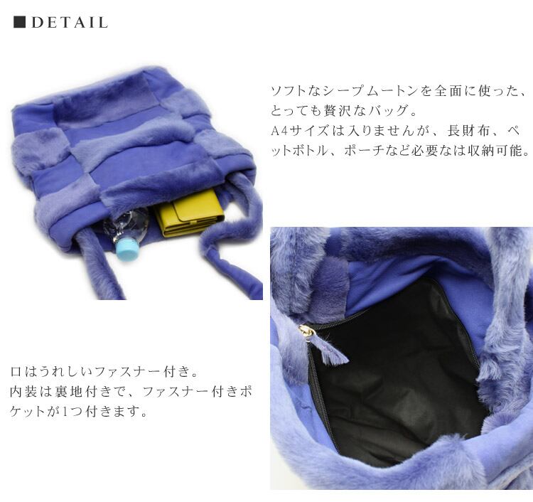 【サイズ(最大部を計測)】横幅約33cm(内側約27cm)、高さ約32cm(内側約26cm)、底マチ約9cm、持ち手長さ約75cm 【重さ】約450g 【ポケット】内側:ファスナー付きポケット×1、オープンポケット×2 / 外側:無し 【留め具】無し 【裏地】有り 【素材】本体・持ち手:シープムートン、内装:合繊生地