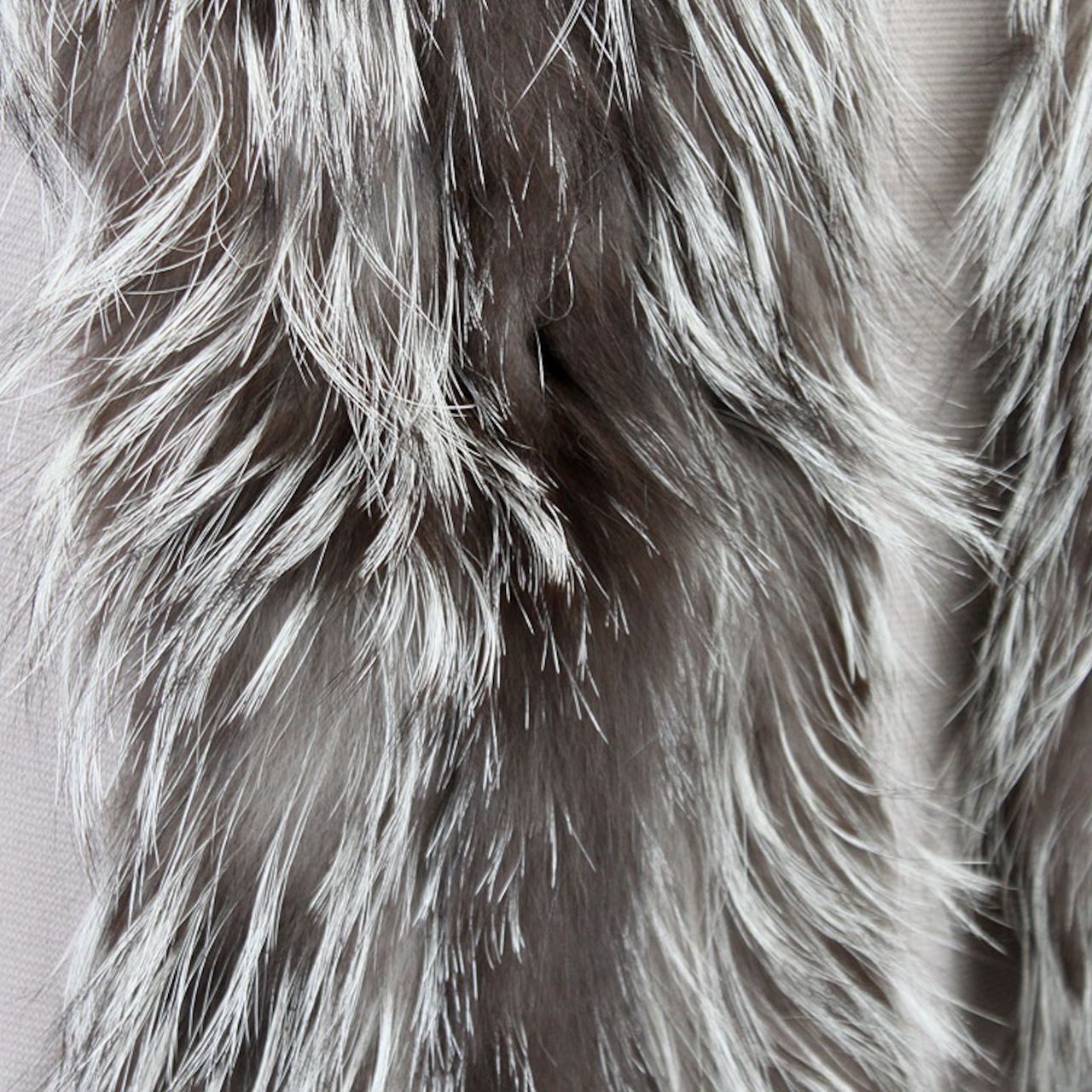 シルバーフォックスのナチュラルな色合いを堪能できるファーマフラーです。ボリューミィながら、ニッティング(編み込み)仕様により軽いのも特徴。