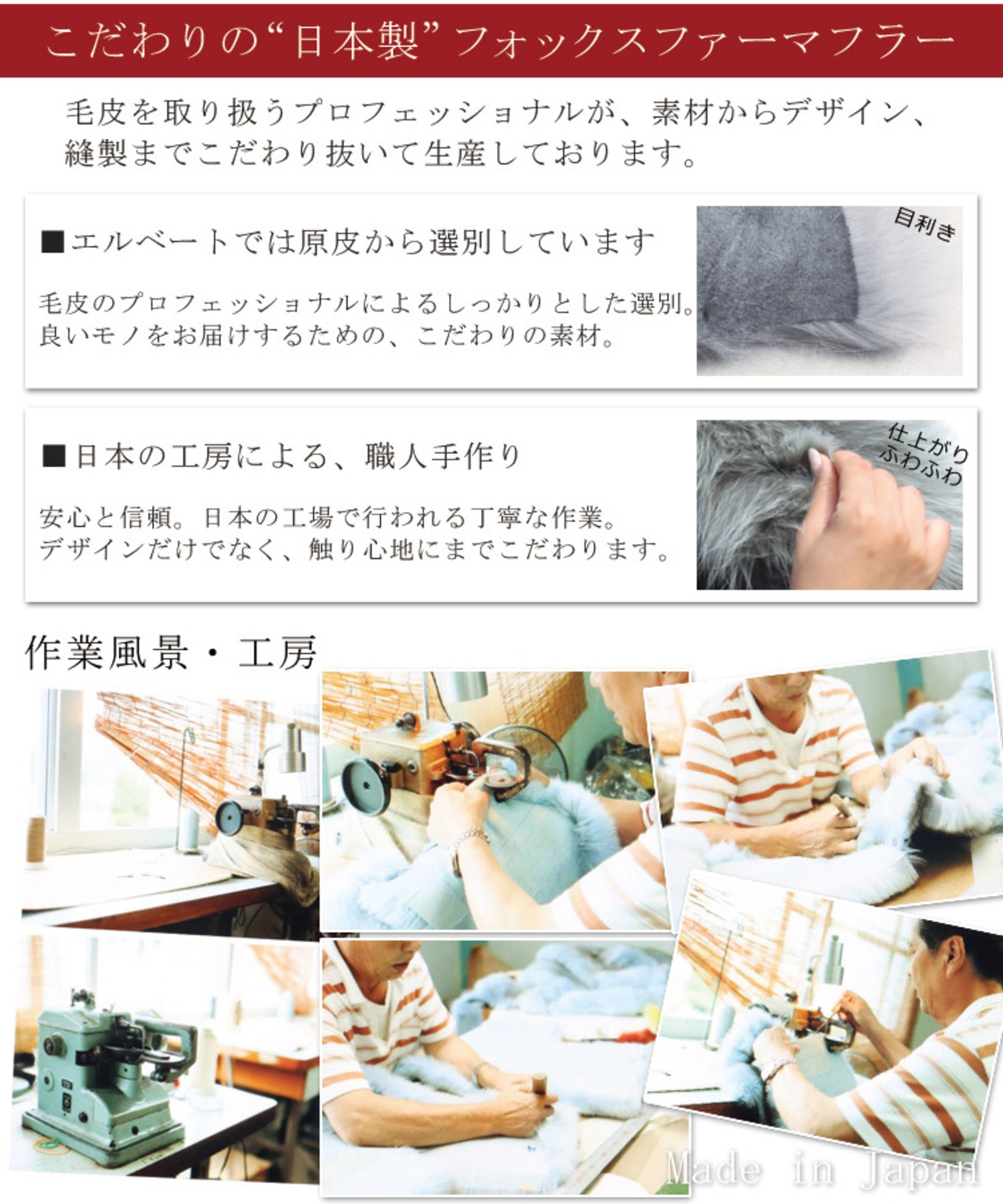 「SAGA(サガ)」とは…「SAGA FURS (OF SCANDINAVIA)」という北欧諸国の生産者の団体が付けている品質表示です。団体の判定した、一定以上の品質を持つファーにつけられるブランドラベルになります。縫製は弊社の契約している日本の工房にて、職人が1つ1つ丁寧に仕上げた、こだわりのマフラーとなっております。