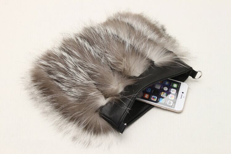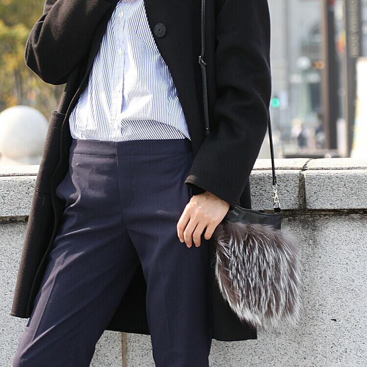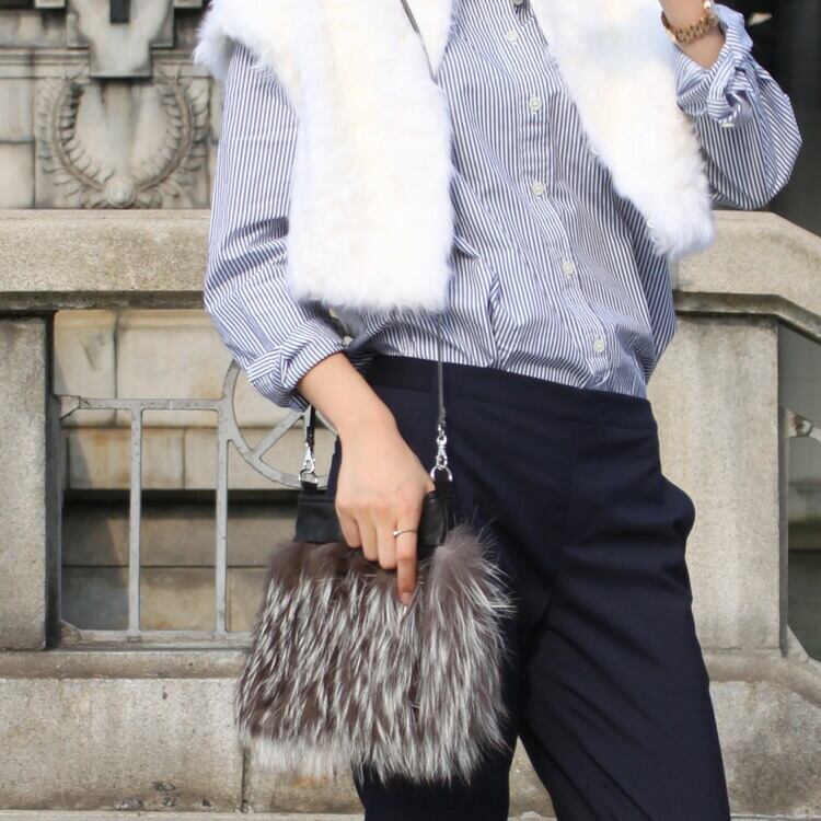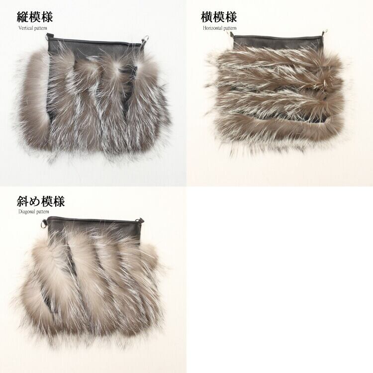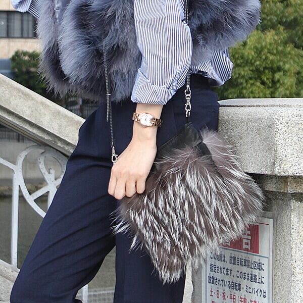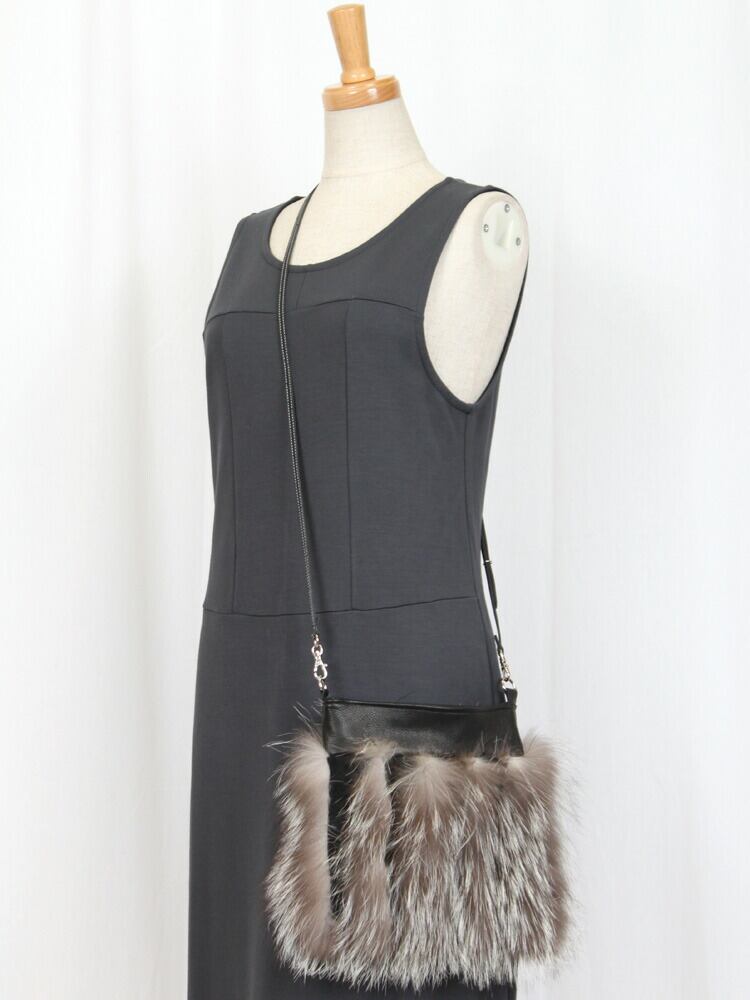シルバーフォックスを使用した個性的なショルダーバッグです。ファーと牛革を交互にライン状にデザイン。小さな見た目ながらエレガントな雰囲気を醸し出します。