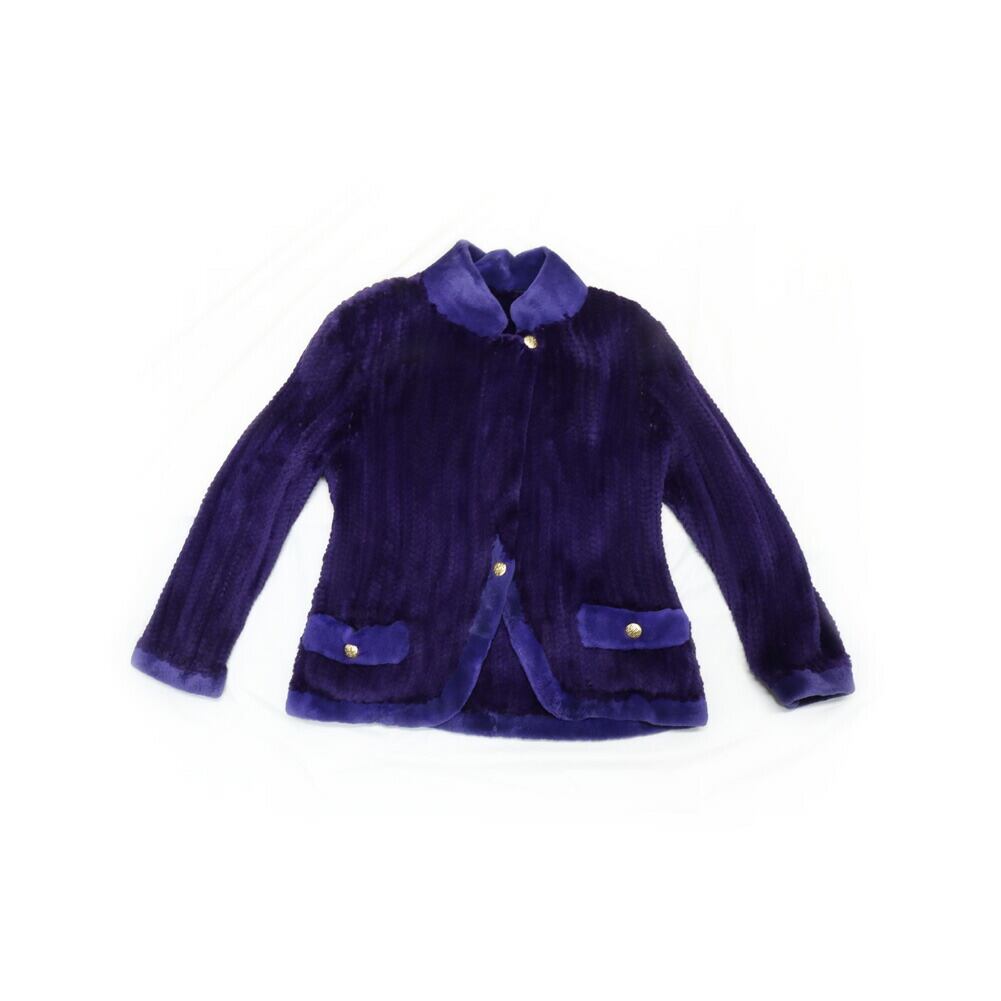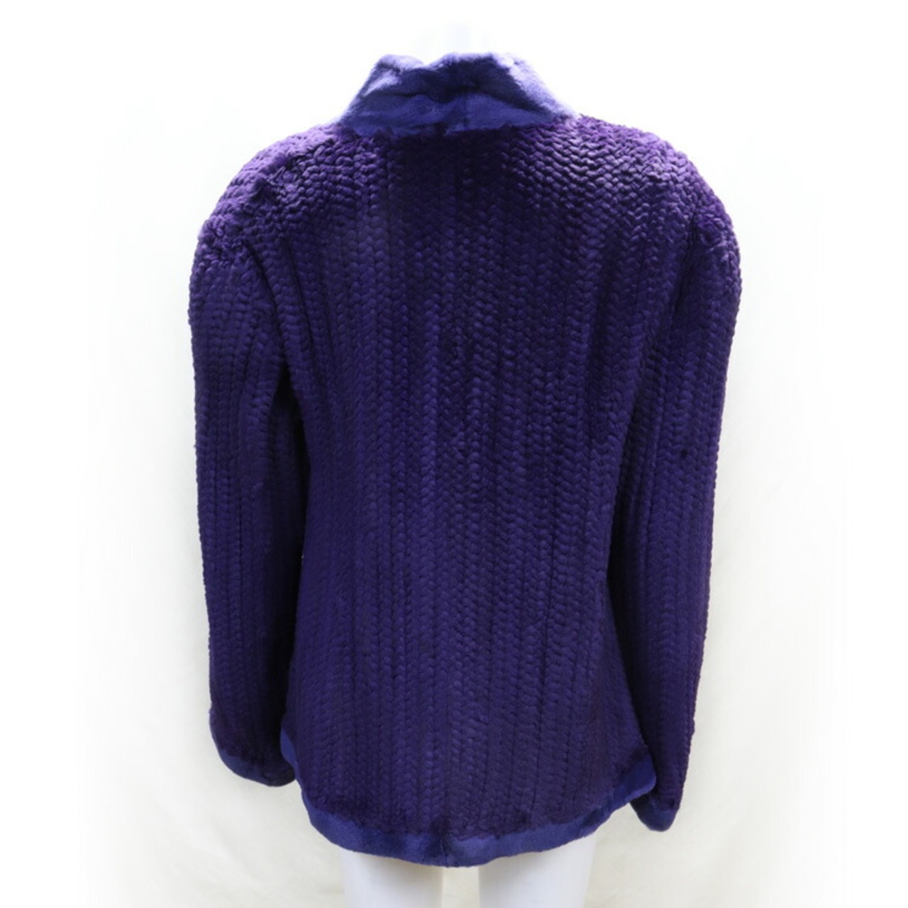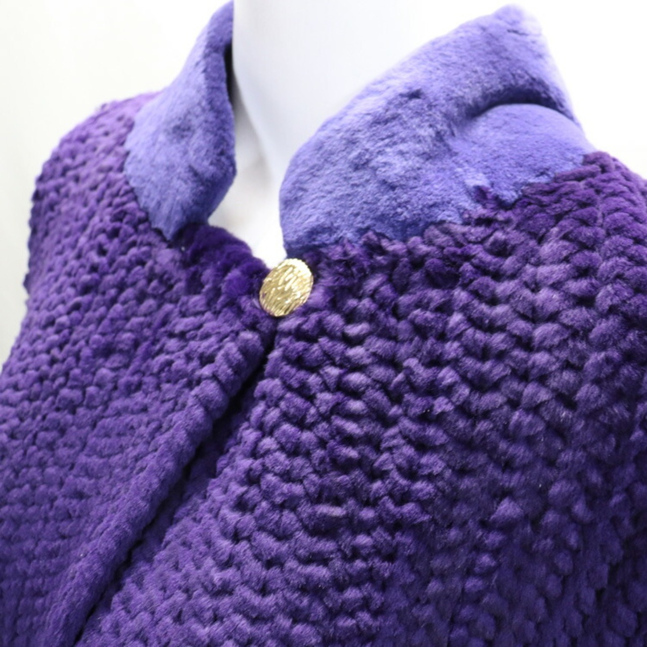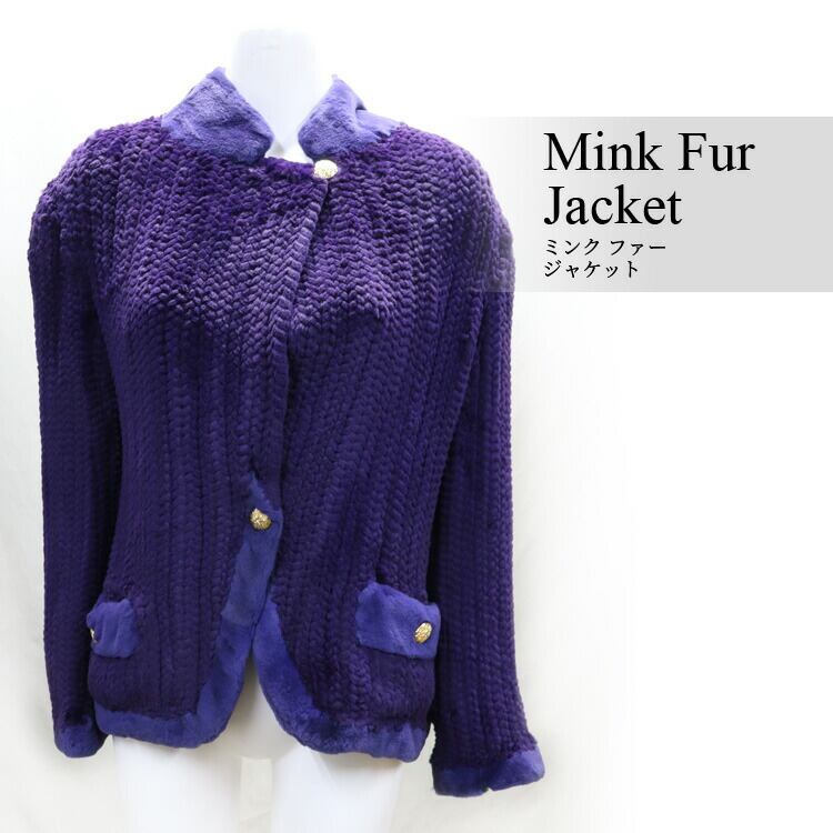 美しいパープルのミンクファージャケット。柔らかいミンクを丁寧に編み込んで使用。光に当たるたびにキラキラと輝く金色のボタンがポイント。カジュアルにもフォーマルにも使えるシンプルデザインが魅力です。
