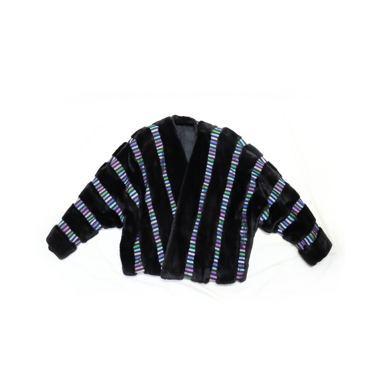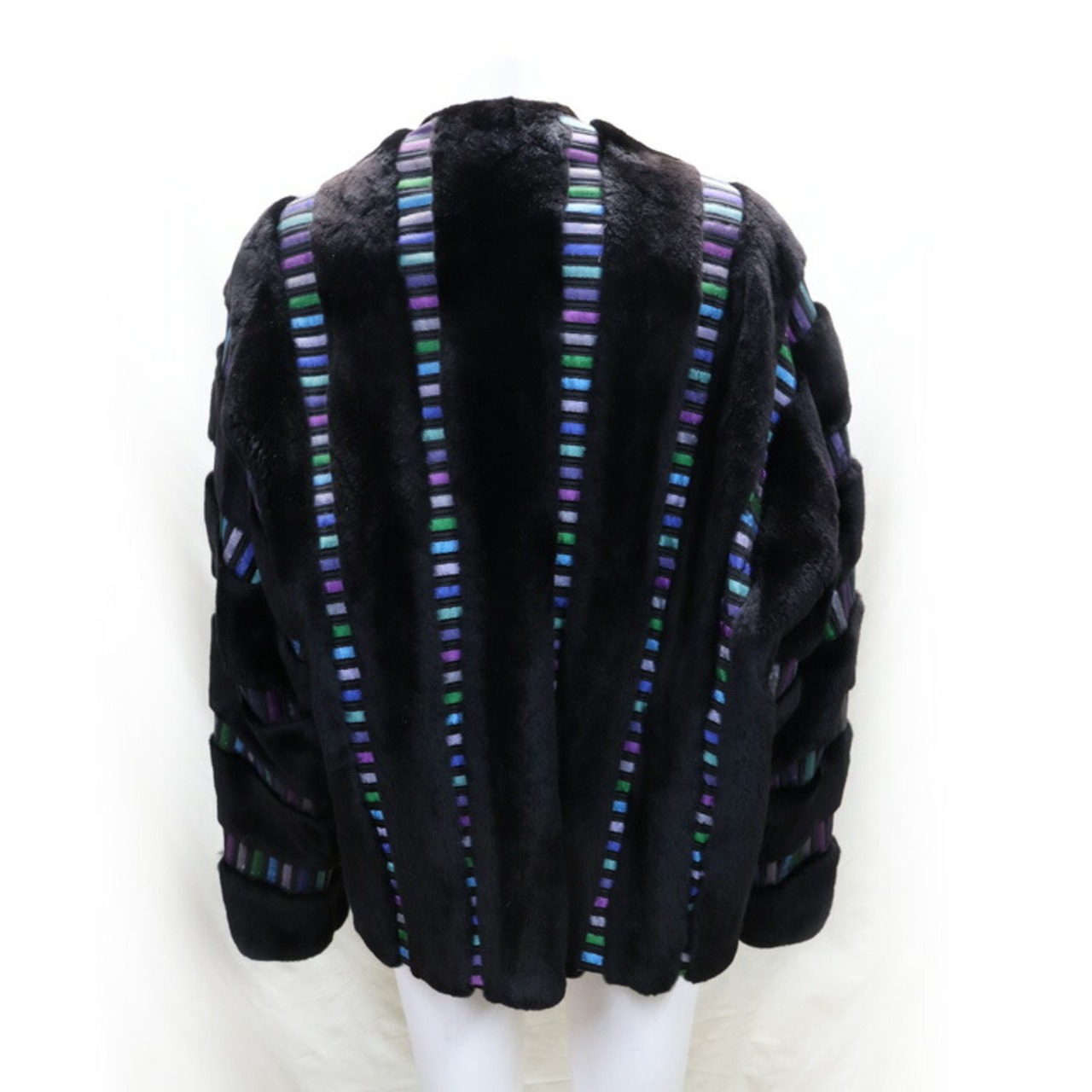 上品な高級素材、ミンクを贅沢に使用したファージャケット。美しいミンクの光沢とマルチカラーのラインが遠くからでも目を引きます。リアルファーならではの暖かさはもちろん、様々なシーンでお使いいただけます。