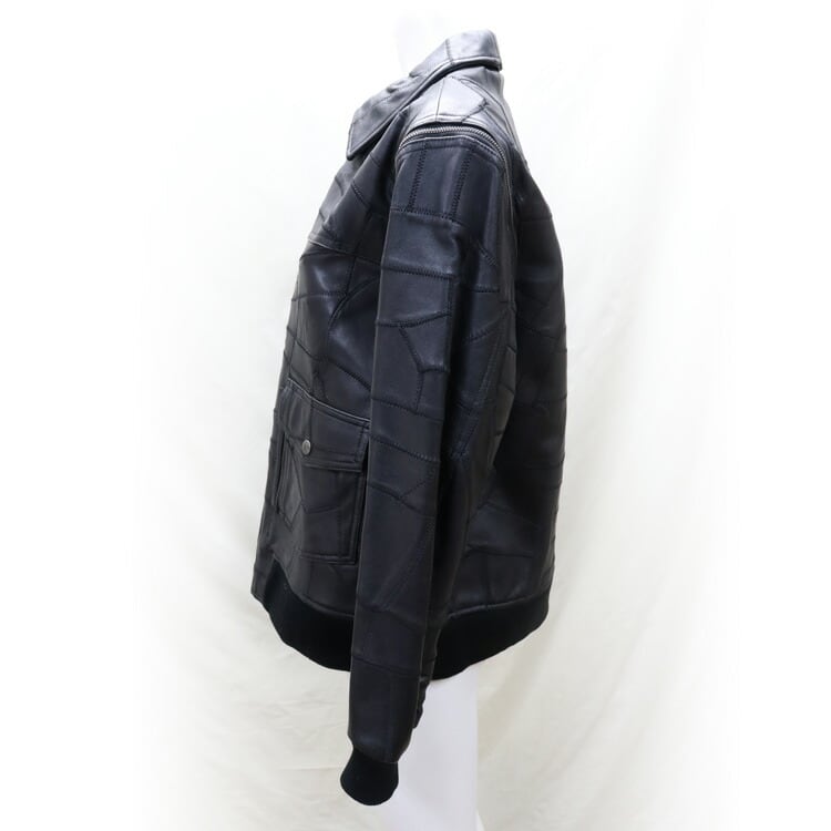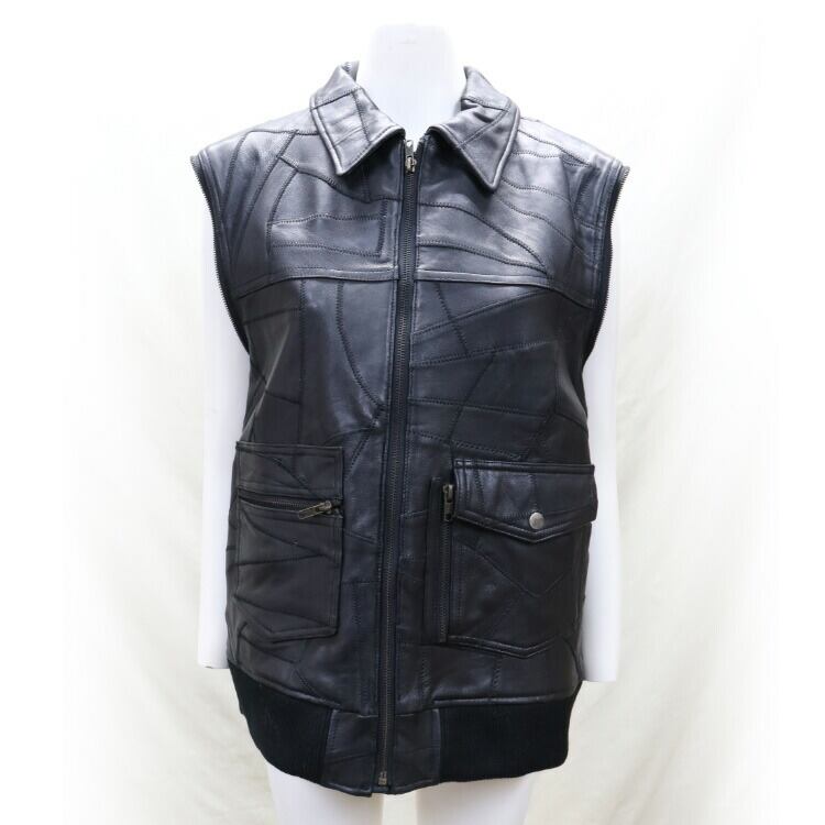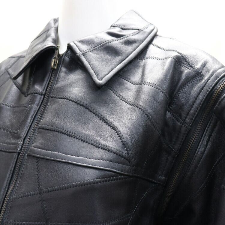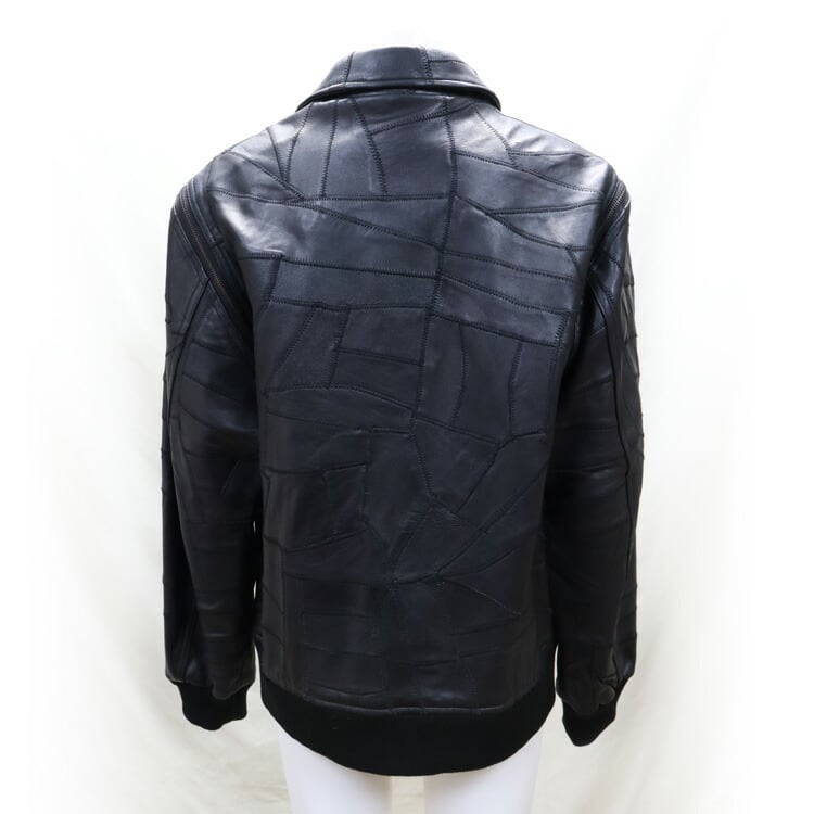上品な光沢感のシープ ナッパ レザーのジャケット。袖部分はファスナーで取リ外し可能。ベスト風に変わります。ポケットの左右のデザインも違い、全体にパッチワークが特徴の魅力的なアウターです。