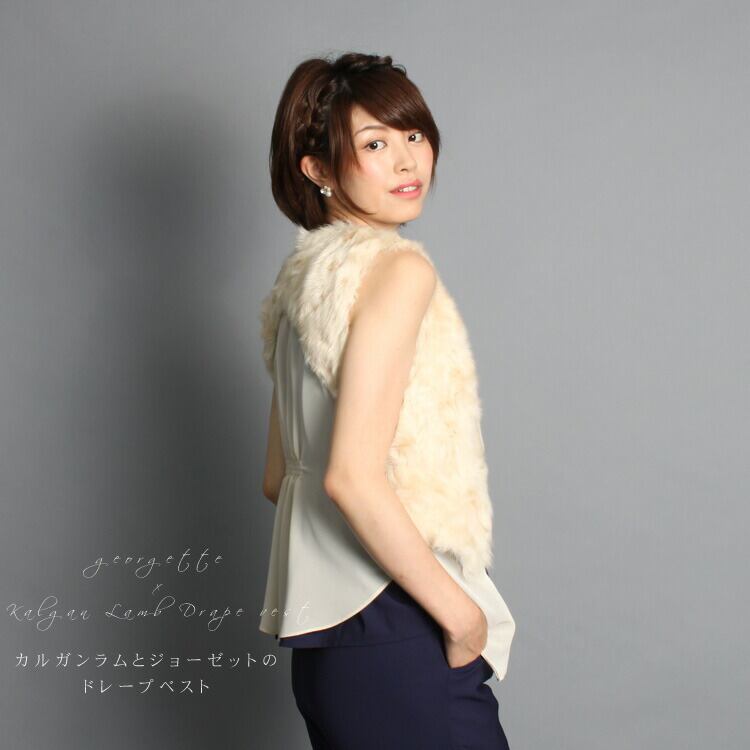 母の日 / ギフト / プレゼント / カーリーでツヤ感のあるカルガンラムと、ドレープが美しいジョーゼットのレイヤードベスト。ラムの中でも、毛足が短めでカーリー、ツヤ感がって上品なカルガンラムと、女性らしいドレープ感が魅力のジョーゼットを合わせたベスト。レイヤード風のデザインとなっており、羽織るだけでこなれた印象に。