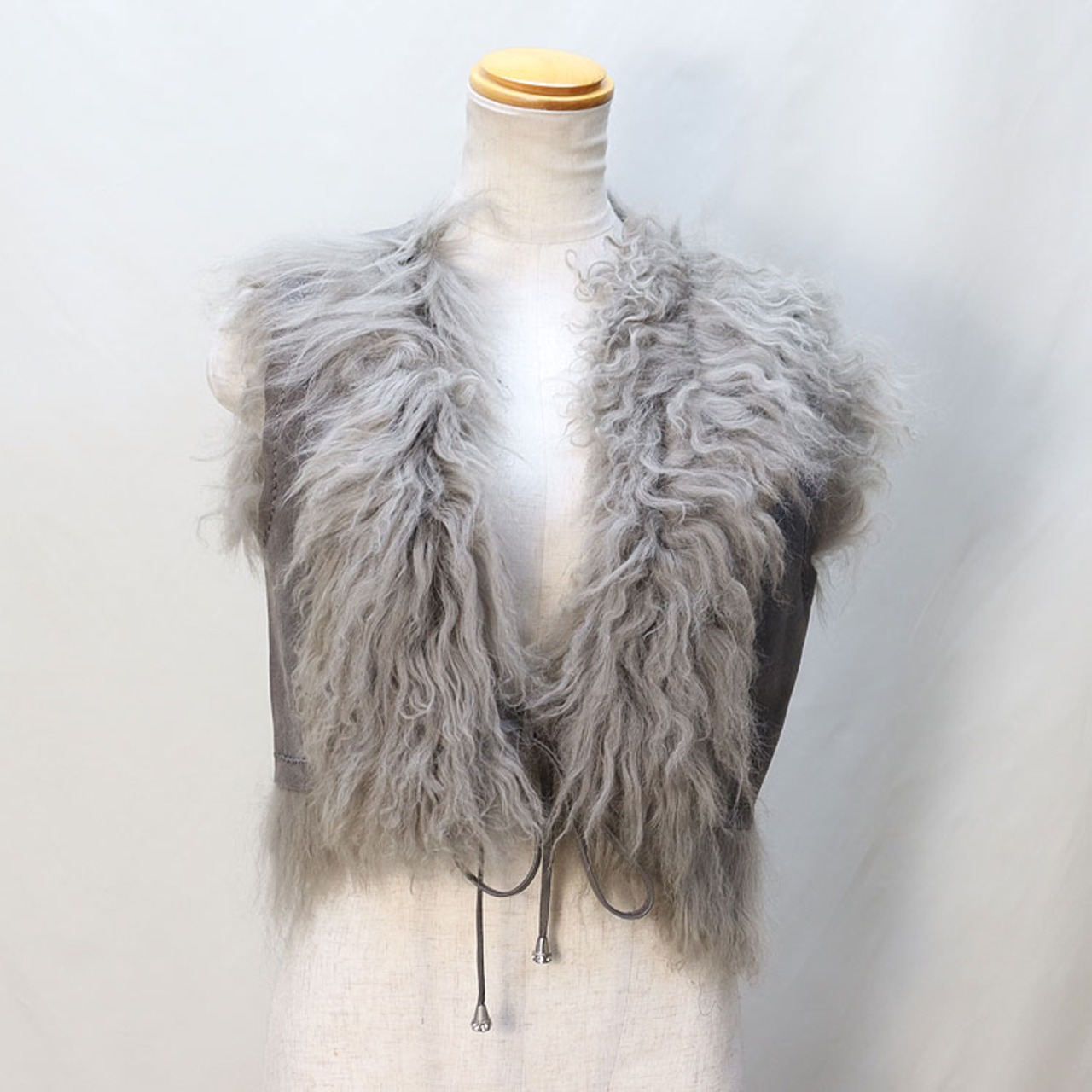 【サイズ(最大部を計測)】Mサイズ相当:肩幅約32cm 着丈約38cm 身幅約88cm アームホール約52cm 【重さ】約250g 【ポケット】無し 【裏地】無し(Wフェイス) 【留め具】紐 【素材】チベットラム、ラビット(Wフェイス)