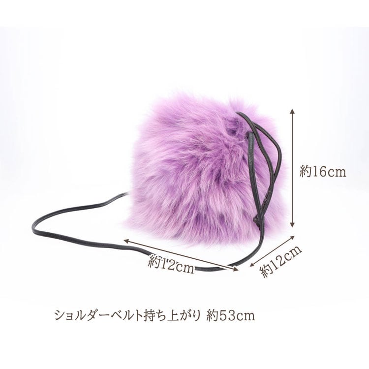 【サイズ(最大部を計測)】縦幅約16cm 底面径約12cm ショルダーベルト持ち上がり約53cm 【重さ】約130g 【内側収納】オープンポケット×1 【外側収納】無し 【留め具】巾着ひも 【素材】ホワイトフォックス、カウレザー 【裏地】有り