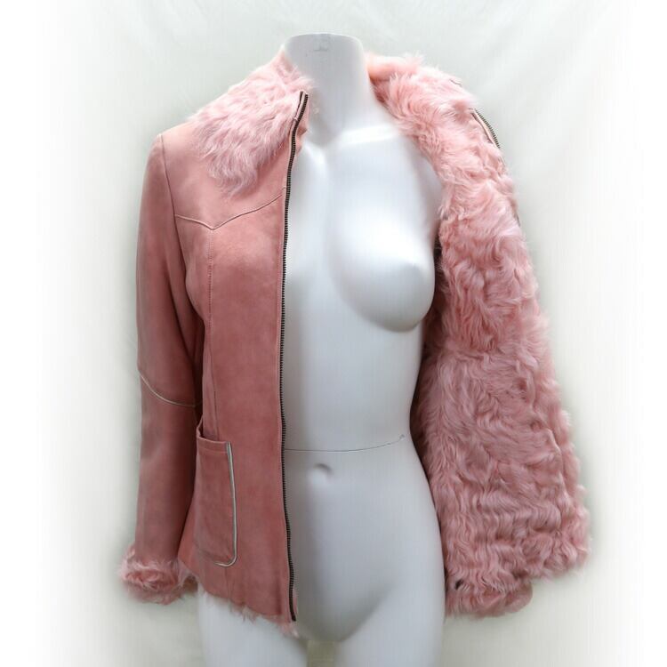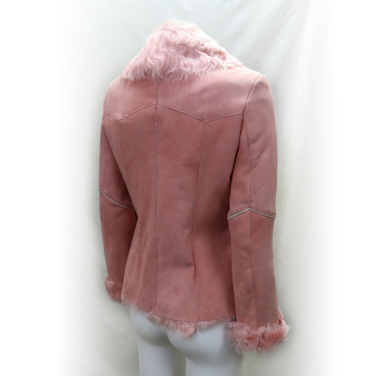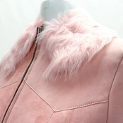 ピンクカラーとカールの毛質が可愛いファージャケット。Wフェイス加工による内側のチキャンラムファーがとても柔らかく、優しい肌触りで暖かいです。着るだけで女性らしく、スカートやパンツなど幅広いコーディネートができるジャケットです。