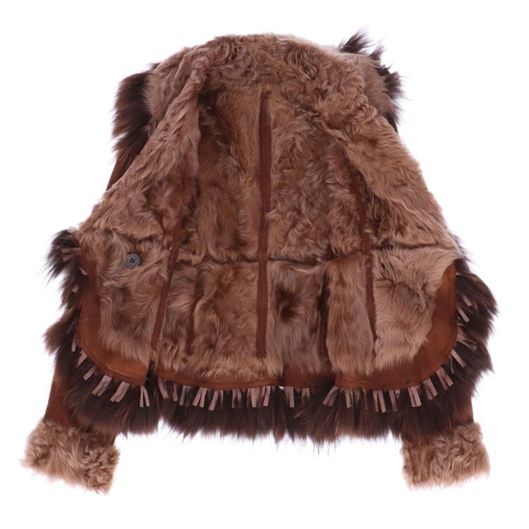【サイズ(最大部を計測)】肩幅約41cm 着丈約61cm 身幅約110cm 袖丈約62cm 【重さ】約770g 【ポケット】無し 【留め具】ボタン×1 【裏地】無し(Wフェイス) 【素材】チキャンラム、ラクーン(タヌキ)