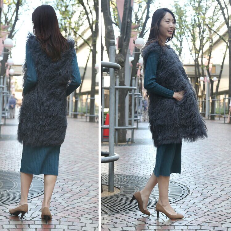 お尻まですっぽり隠れるロングベストタイプなので、暖かいのはもちろん、スタイルカバーにもなるので女性のための心遣い◎この見え方を維持しつつ重くならないよう、表面は生地とファーを交互に縫い付けたボーダーデザインになっています。更にデザインを損なわないよう、ポケットもスリットタイプが両サイドに1つずつ。気軽に着こなせながらセレブ感もあり、どこからみてもふんわり可愛い。リアルファーならではの保温性も抜群。貴方の体を優しく暖めてくれることでしょう。
