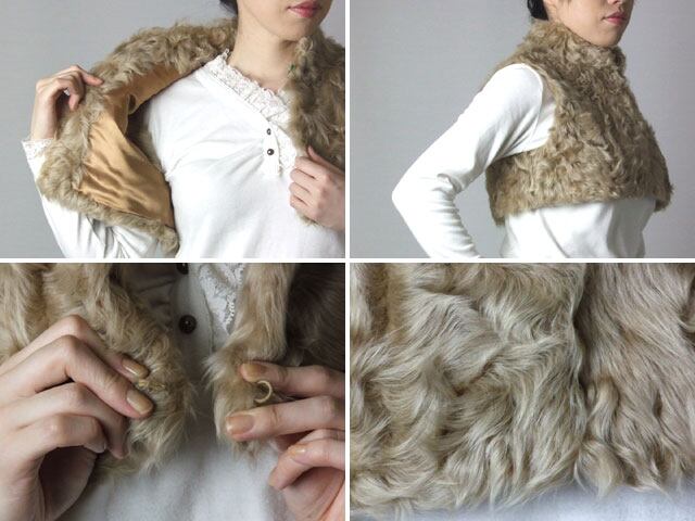 【サイズ(最大部を計測)】着丈約35cm 身幅約92cm 肩幅約36cm 【ポケット】無し 【留め具】ホック 【裏地】有り 【素材】チキャンラム