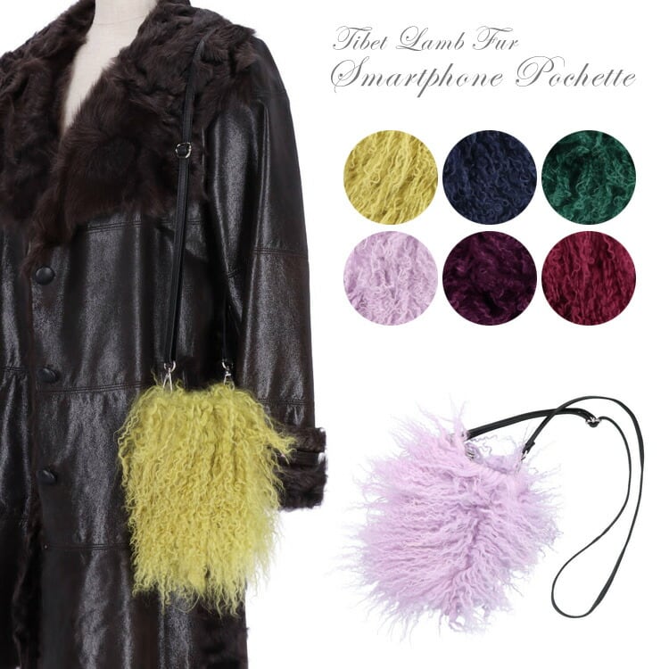 カールした毛足が個性的なチベットラムを使用したスマホポシェットです。贅沢に使用した長めのラムファーがボリューム感を出し華やかに。日本の弊社契約工場にて、一つ一つ職人による手作りです。スマートフォンを入れるに特化したショルダーバッグなので、コンパクト&軽量。アクセサリー感覚で使えるポシェットです。ショルダーベルトは取り外し可能なので、お手持ちのものなどに変更も出来ますよ。