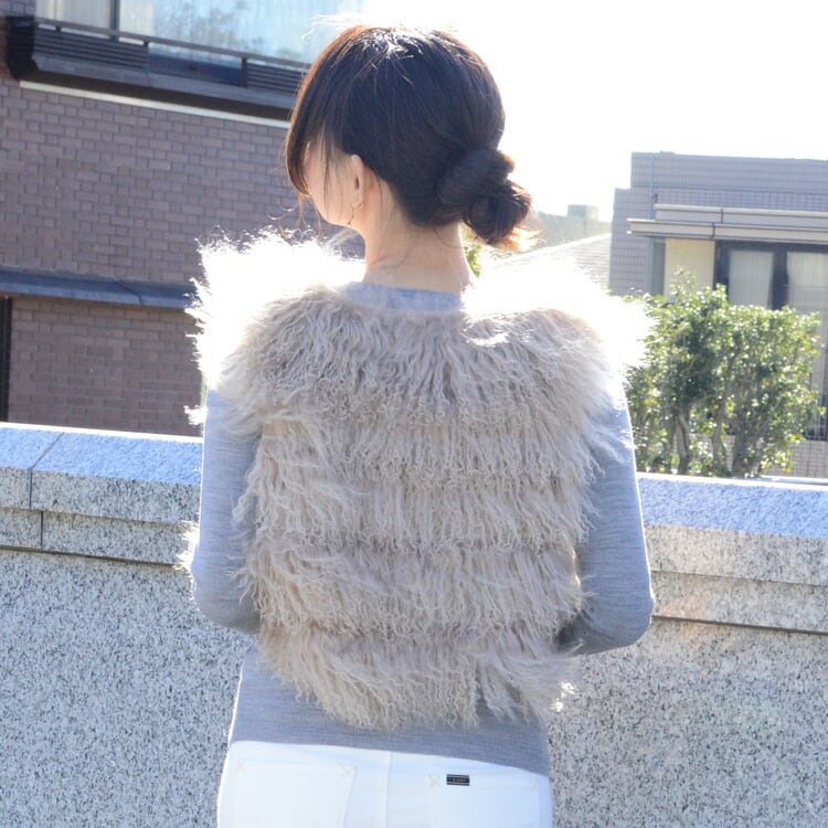 くるくるしたカールの綿毛が可愛らしいチベットラムをスタイリッシュなショート丈ファーベストに仕立てました。ラムの中でも最も毛足の長いと言われているチベットラムは表面を触ると手が隠れてしまう程のボリューム。そのラムファーを生地に貼り付けることによってボリュームを程よく抑えた非常に軽やかな見た目になりました。勿論リアルファーならではの保温性は抜群。ショート丈ながら貴方の体を優しく暖めてくれることでしょう。