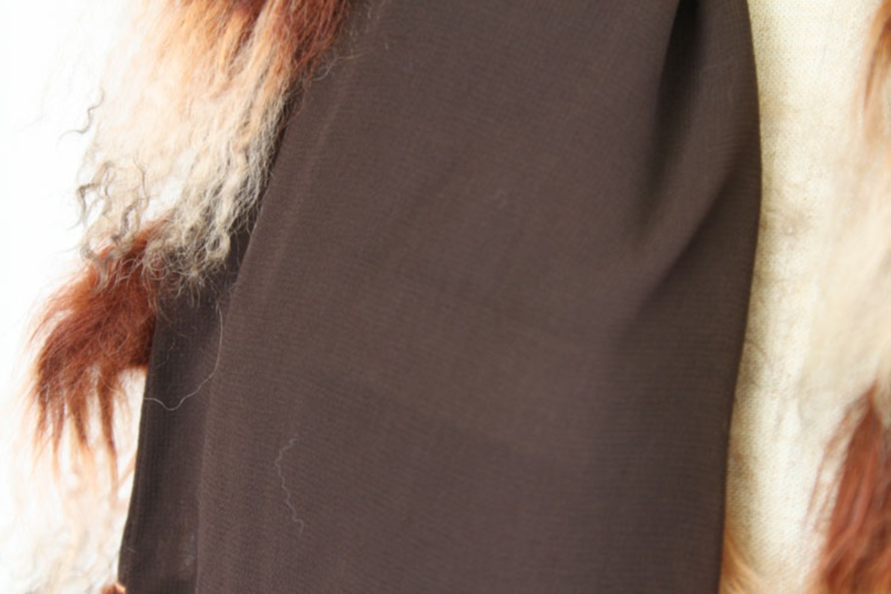 独特なカールが可愛らしいチベットラムとシフォン生地を交互に連ねたファーストール。程よいボリュームになり、段になった見え方も個性的です。