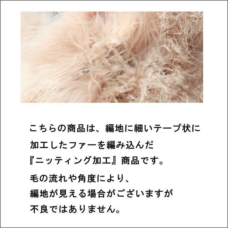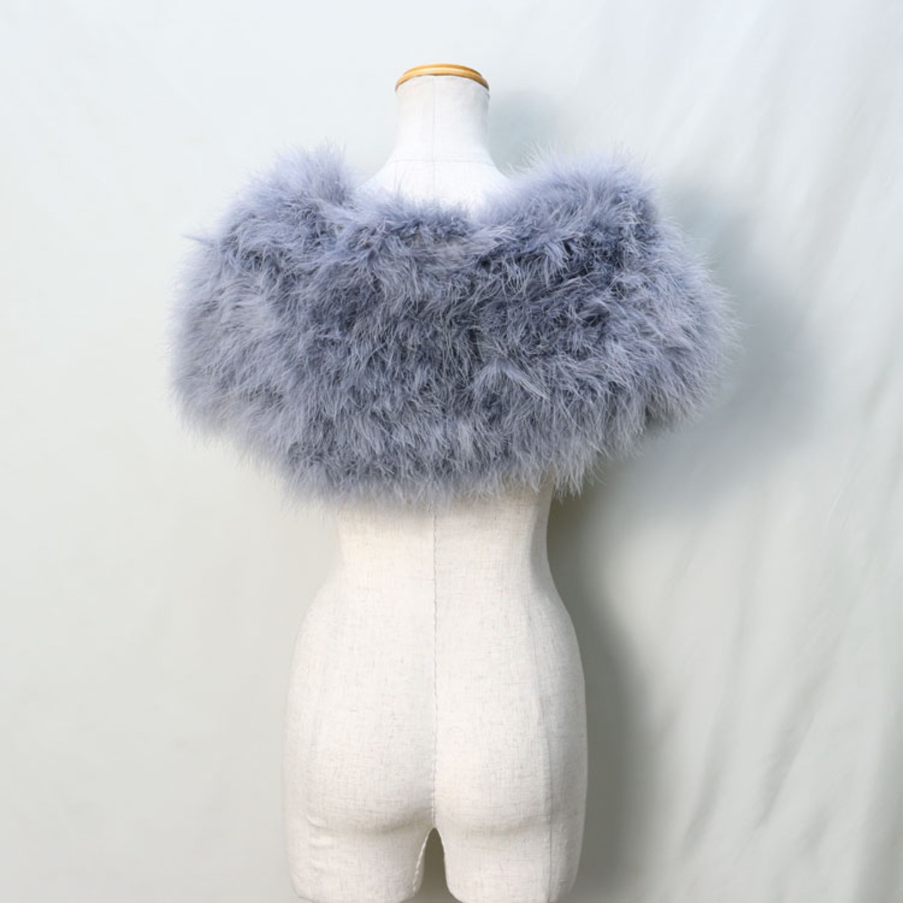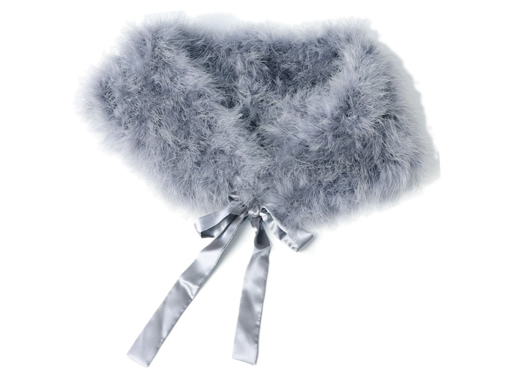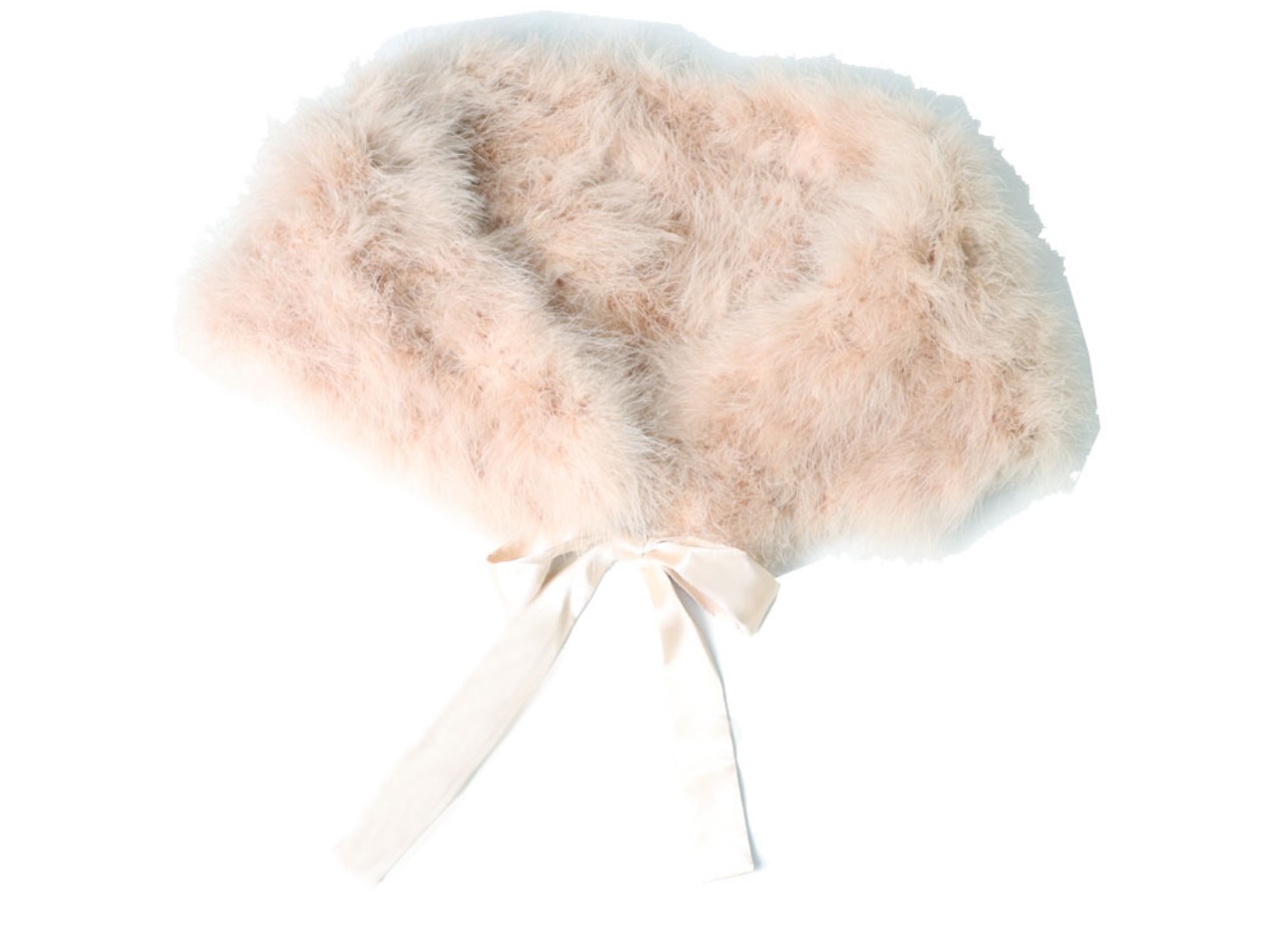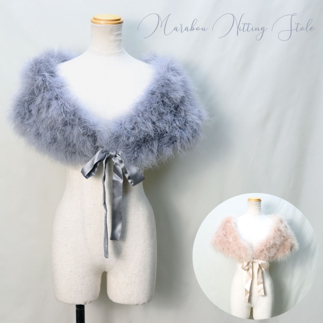 マラボーとは、ハゲコウ(大型コウノトリの総称)の翼や尾の下の柔らかい羽毛です。ボリュームたっぷりで存在感は抜群ですが、ニッティング加工により、驚くほど軽く(約135g)仕上げる事が出来ました。