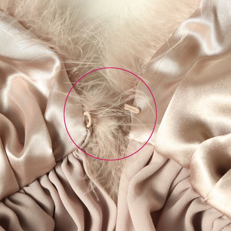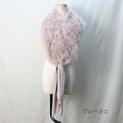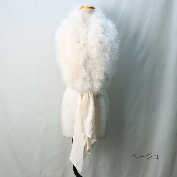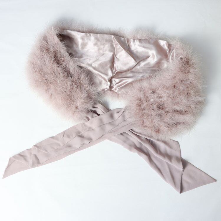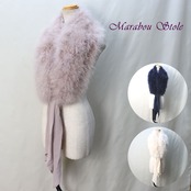 マラボーとは、ハゲコウ(大型コウノトリの総称)の翼や尾の下の柔らかい羽毛です。ボリュームたっぷりで存在感は抜群ですがとても軽く(約150g)、しっとりとした肌触りで華やかに胸元を飾ってくれます。