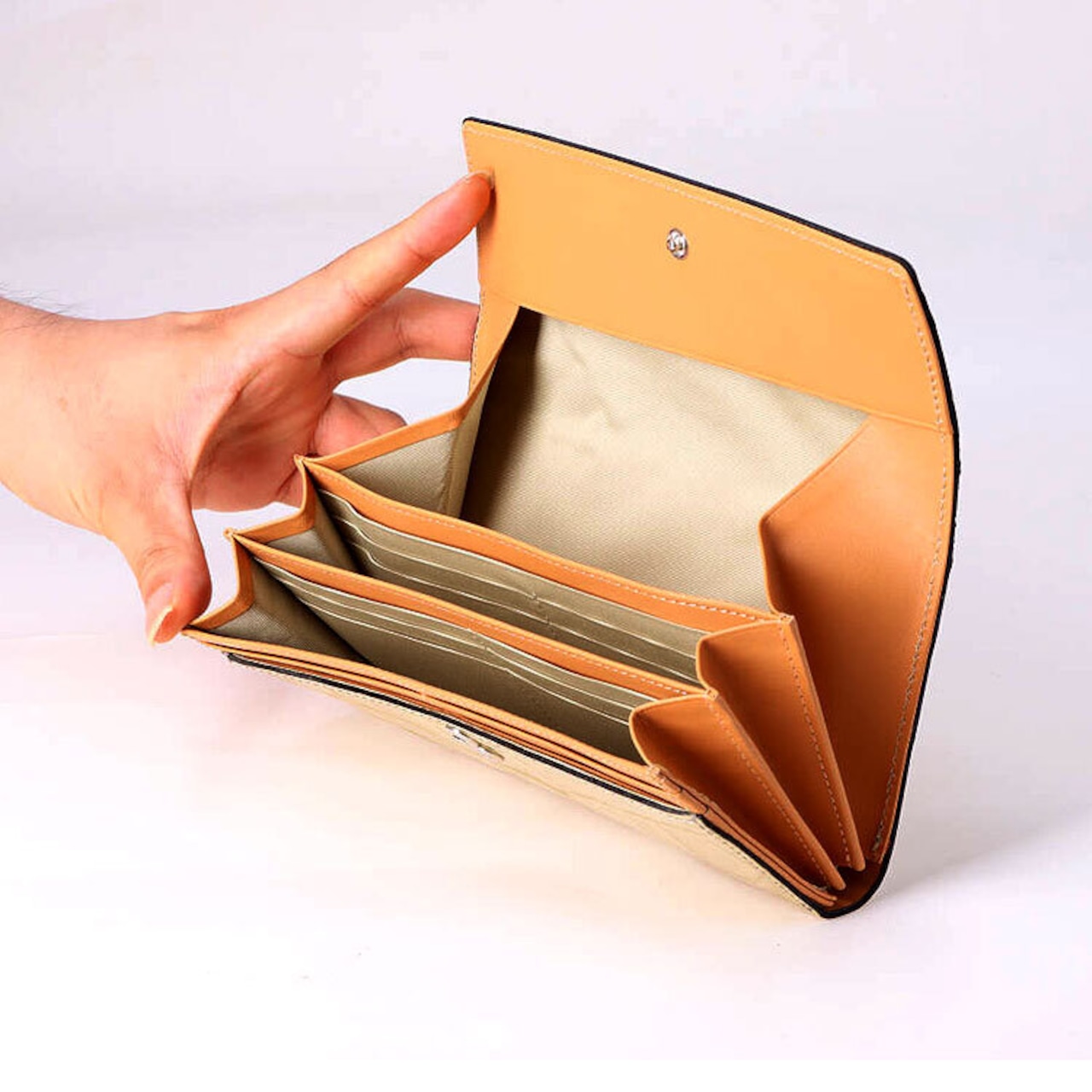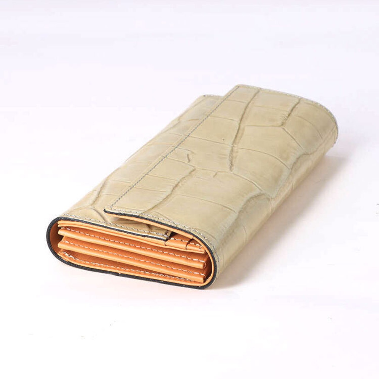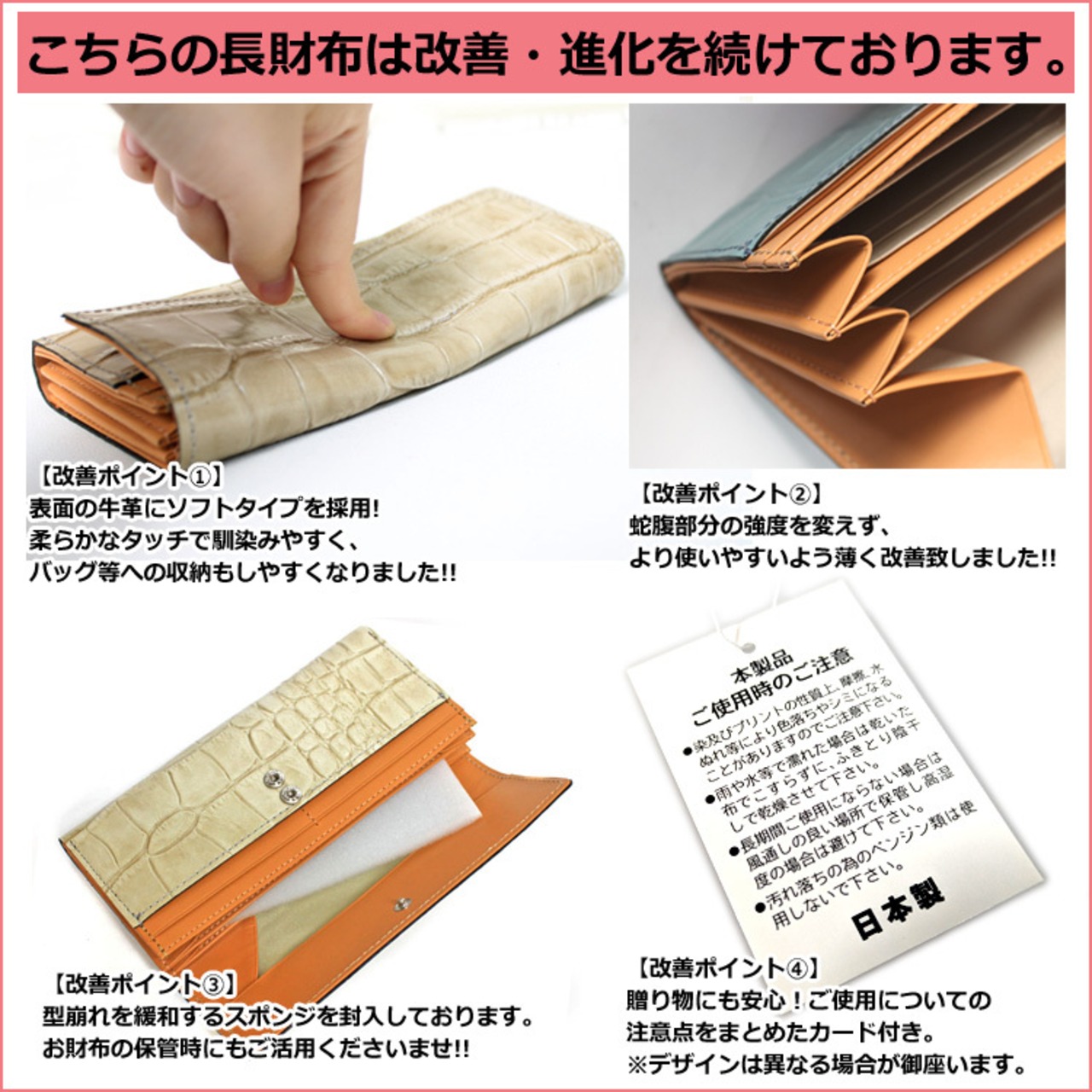 【サイズ(最大部を計測)】高さ約9.5cm、長さ約19.5cm、厚み約3.5cm 【重さ】約160g 【ポケット】内側:カードポケット24室、お札スペース2室、オープンポケット3室、コインスペース1室 外側:無し 【留め具】2段階スナップボタン 【裏地】有り 【素材】表:牛革 内装:レーヨン/コットン 【生産国】日本