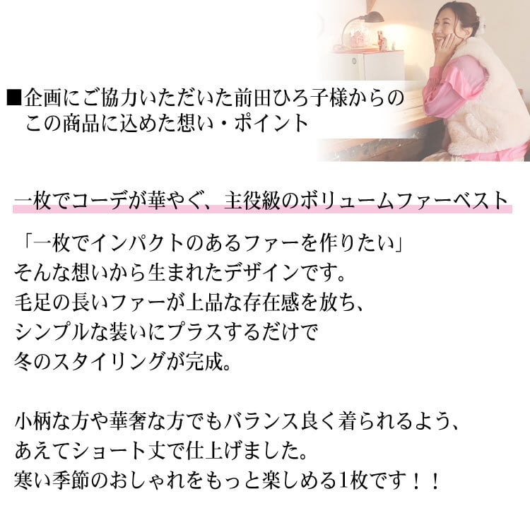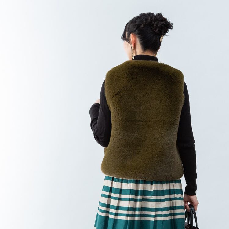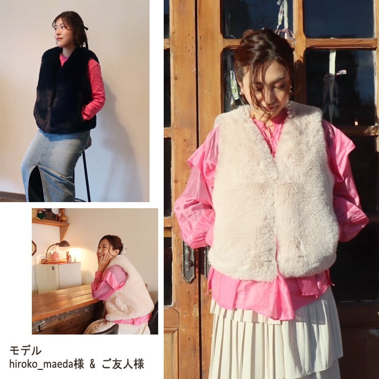 本物のような手触りと風合い。ファーショップが手がけるこだわりのエコファーシリーズ。本物のような手触りと風合い。ファーショップが手がけるこだわりのエコファーシリーズ。その魅力を更に高めていきたい!と、パーソナルスタイリスト、ファッション専門学校講師としてご活躍中の前田 ひろ子様 ( @hiroko_maeda )をお招きし、こだわりのエコファーベストを製作しました!ファーの種類、サイズ感、表裏の配色などを細かく打ち合わせ、更にインスタグラム上でアンケートを取りファーの長さを決定。ファーの縫製に長ける工房にて丁寧に仕上げていただきました。