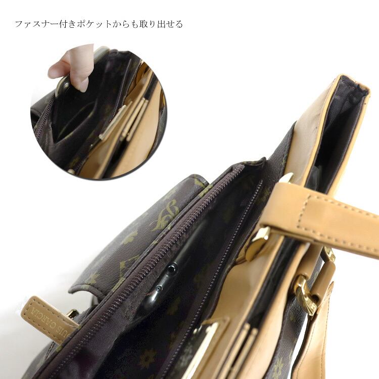 高級感あるロゴグラムで大人の上品さを演出するブランド「ルイ・ガルシア」から普段使いに最適なスマホが取り出しやすい多機能の手提げ。高級感のあるロゴグラムがオシャレなデザイン。かくし取り出し口付きでスマホが2つのポケットから取り出せるからとっても便利!持ちやすい大きさながら物が出し入れしやすく、たくさん入るデザインで機能性にも優れています。
