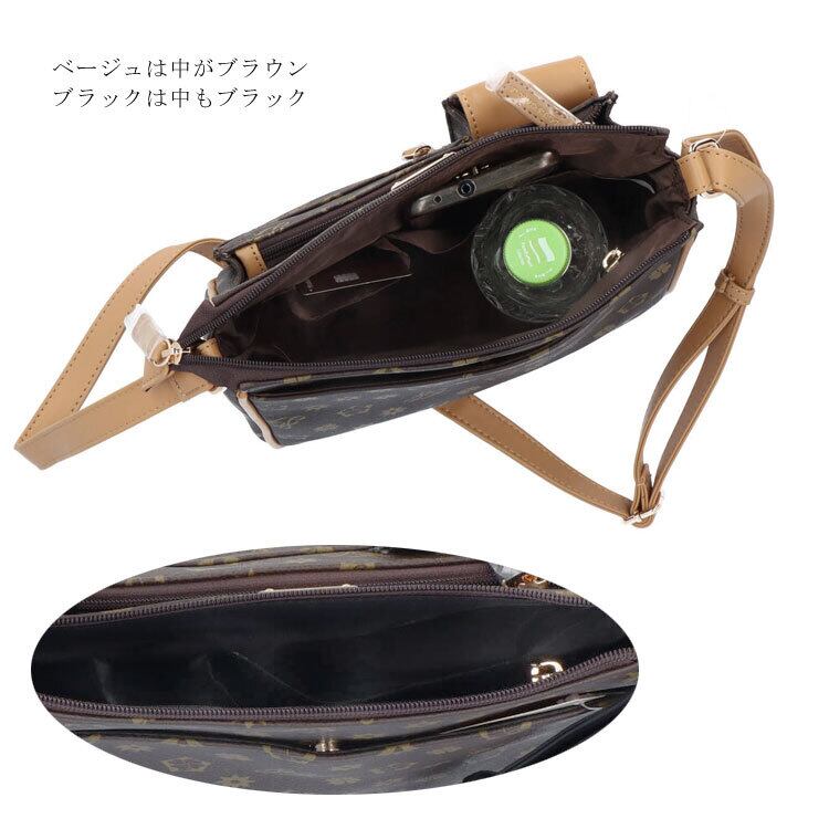 【サイズ(最大部を計測)】縦幅約22cm 横幅約24cm マチ幅約10cm ショルダーベルト長さ約72から131cm 【重さ】約410g 【内側収納】ファスナーポケット×1、オープンポケット×2 【外側収納】ファスナーポケット×2、マグホックポケット×1、後マグホックポケット×1 【留め具】ファスナー 【裏地】有り 【素材】合成皮革 【生産国】中国