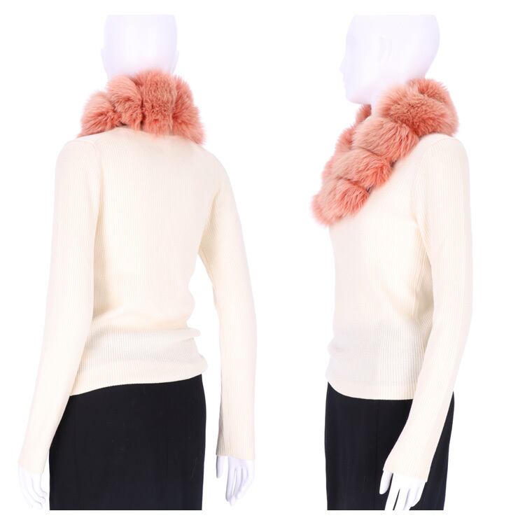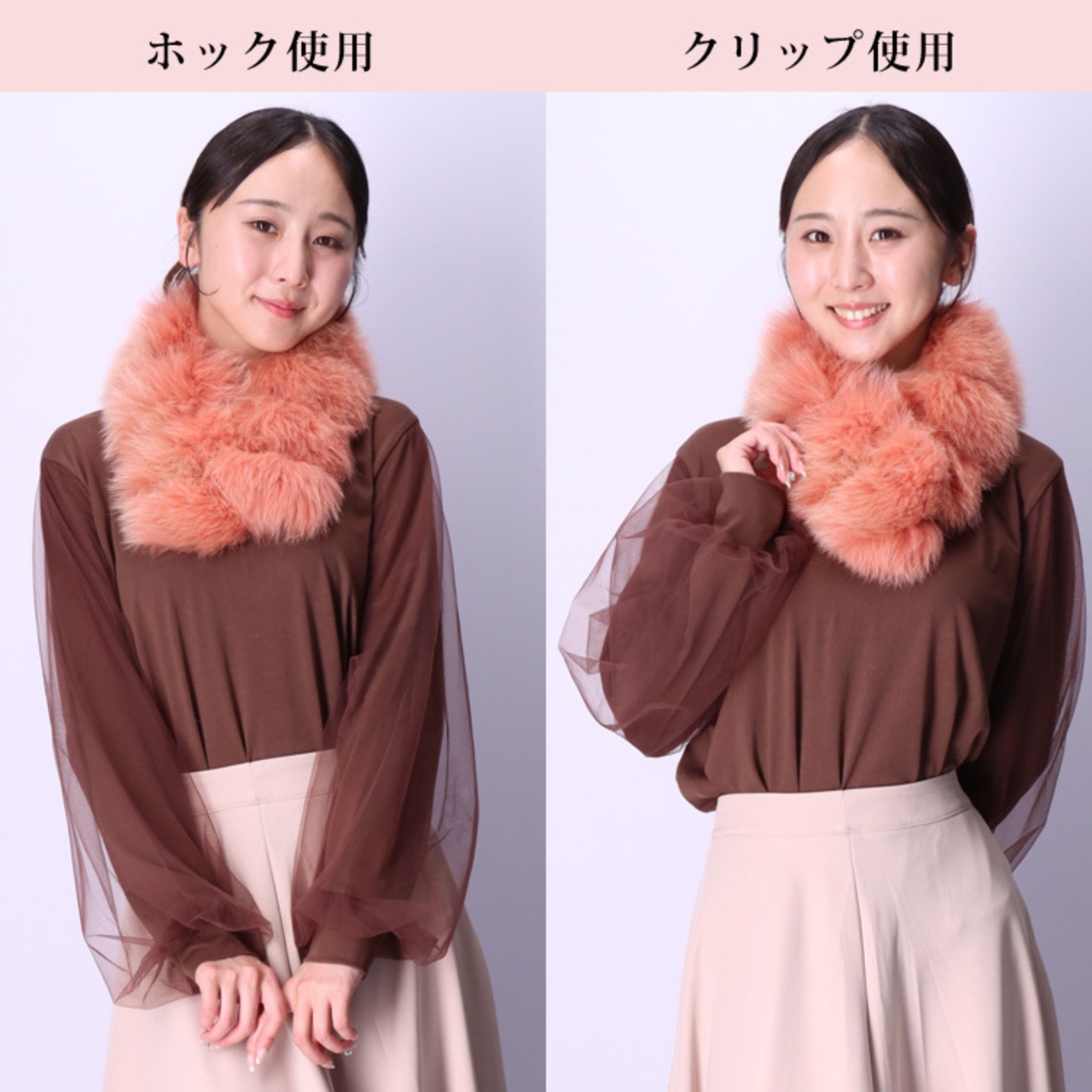 ブルーフォックスを贅沢に使用したファーマフラーです。縫製は弊社の契約している日本の工房にて、職人が1つ1つ丁寧に仕上げました。フォーマルに、ドレスや和装はもちろん、カジュアルにニットやジャケットの上から合わせてもゴージャスです。留め具はホックとクリップの2種類で、スタイルに合わせて付け替え可能。珍しい個性派のサーモンピンクカラー、もこもことした凹凸が可愛らしさを引き立てます。