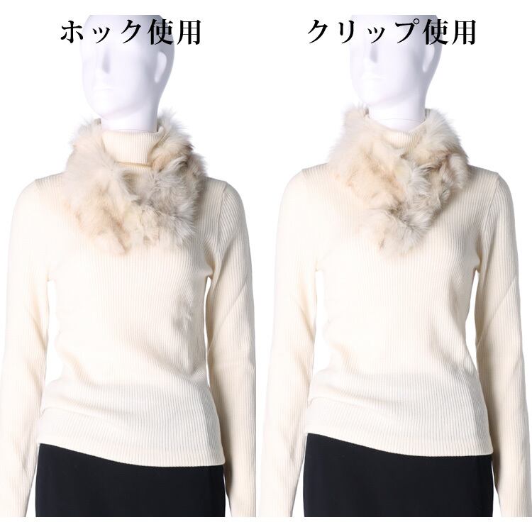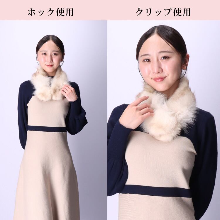 ブルーフォックス、そのナチュラルな風合いを活かしたファーマフラーです。縫製は弊社の契約している日本の工房にて、職人が1つ1つ丁寧に仕上げました。フォーマルに、ドレスや和装はもちろん、カジュアルにニットやジャケットの上から合わせてもゴージャスです。留め具はホックとクリップの2種類で、スタイルに合わせて付け替え可能。