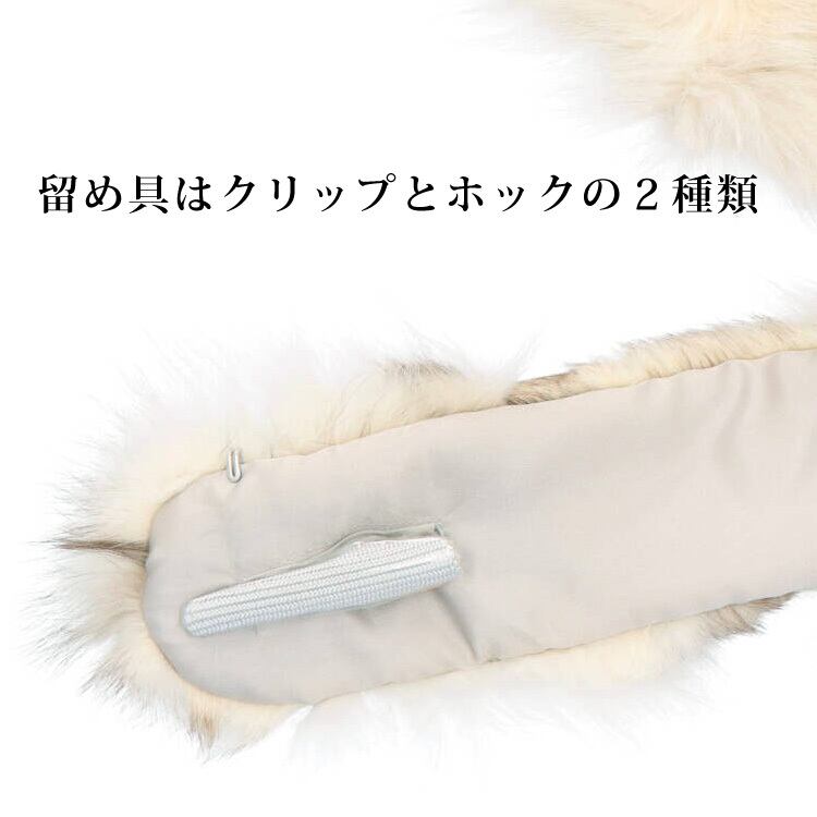【サイズ(最大部を計測)】毛を含む:長さ約70cm 幅約12cm / 裏地のみ:長さ約65cm 幅約7cm 【重さ】約70g 【留め具】クリップ×1・ホック×1 【素材】表地:ブルーフォックス、裏地:アセテート50%、キュプラ50% 【裏地】有り 【生産国】日本